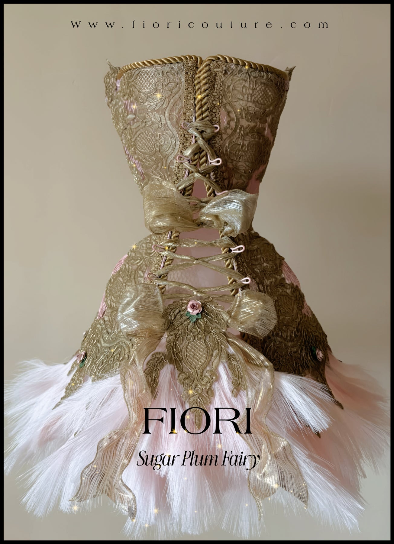 FIORI ‘S precoccupation with flowers when creating each iconic design, of course there are hand painted metal roses sprinkled throughout the Corset, Crown and Ballet Point Shoes, but this corset was entwined with the romance of Fashion house CHANEL .