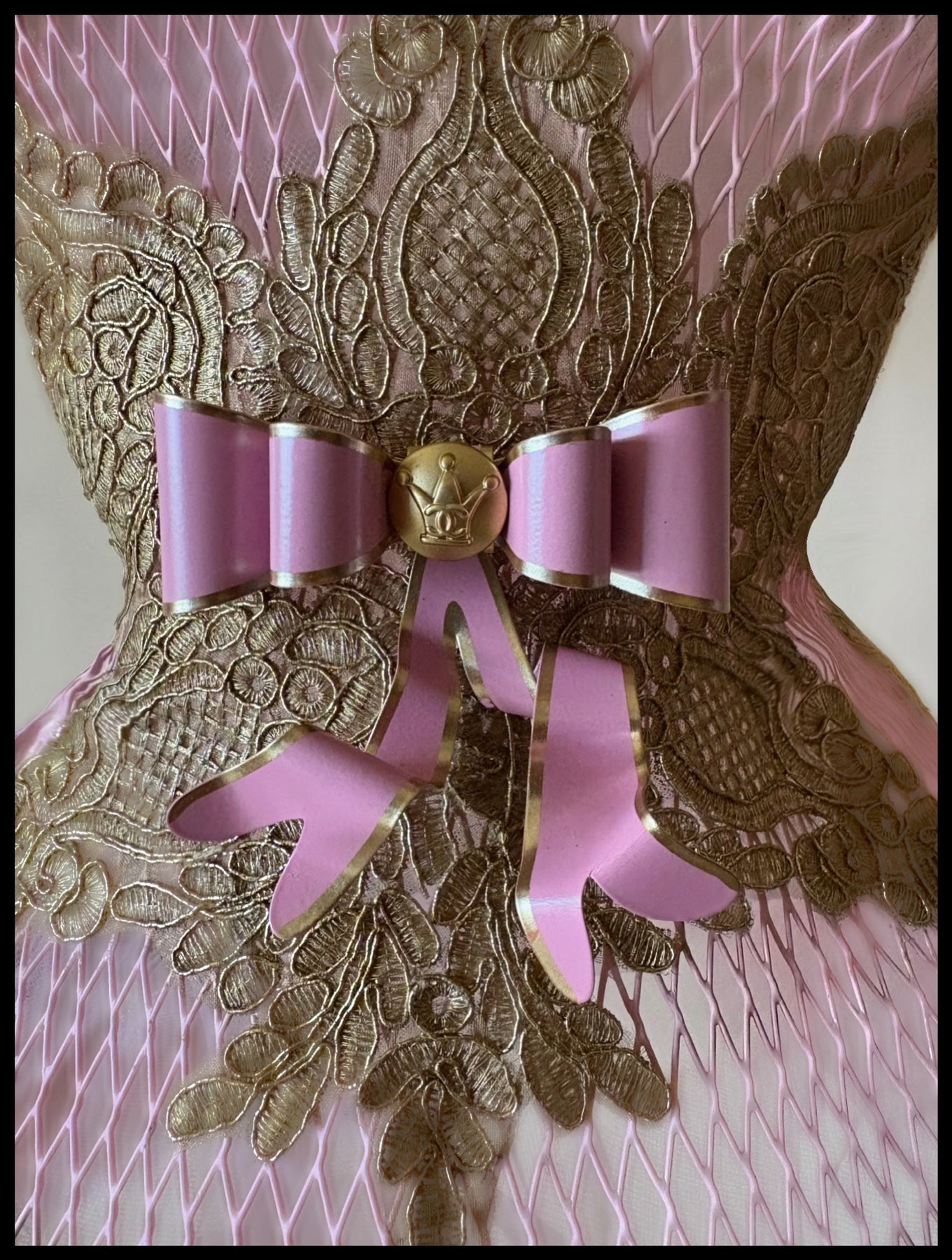 Delicate gold lame French lace graces the bustline, waist and skirt of the corset with blush colored plumes on hemline and shoes. Corset embellished with rare vintage 1970’s CHANEL Crown buttons on each metal pink bow .
